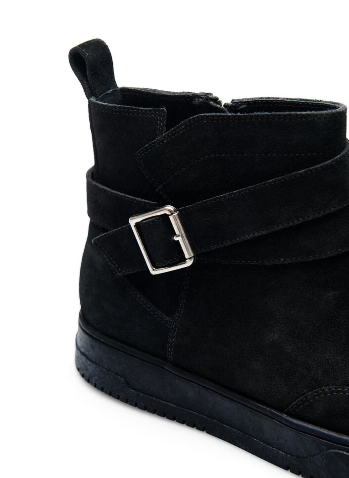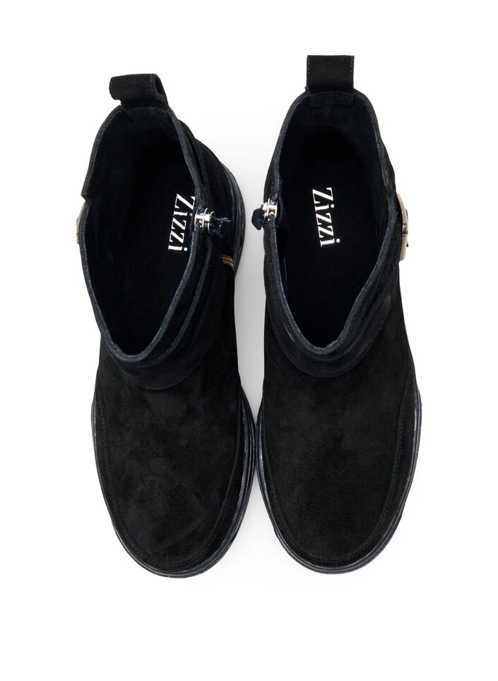 Short boot with a wide fit and zipper. The boot is made of suede, which gives it a timeless look and makes it useful in many different contexts. The buckle on the outside is not functional, but there is a zipper on the inside.