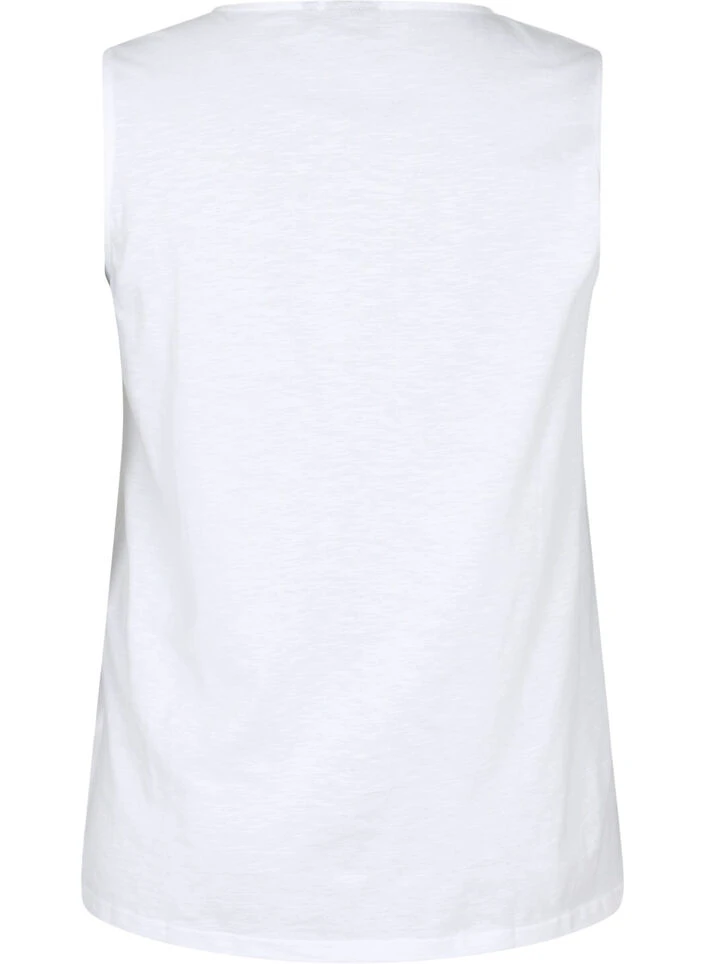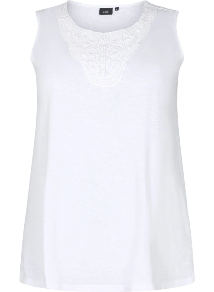 Sleeveless top in 100% cotton, which has a loose fit with a round neckline and feminine lace details on the chest.