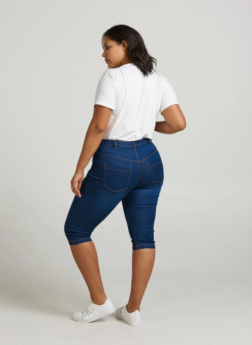 Simple capri jeans with a slim fit and regular waist. They have a simple deisgn with pockets and belt loops, and are made from a stretchy and comfortable cottom mix.