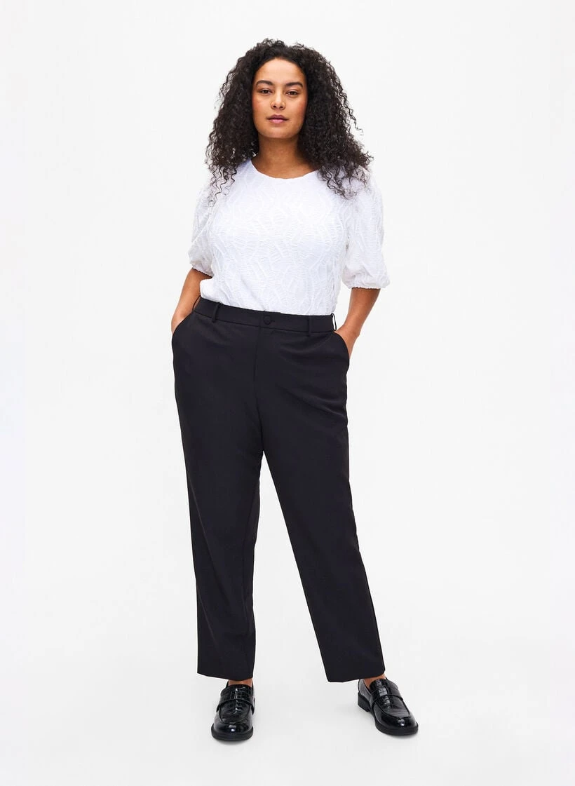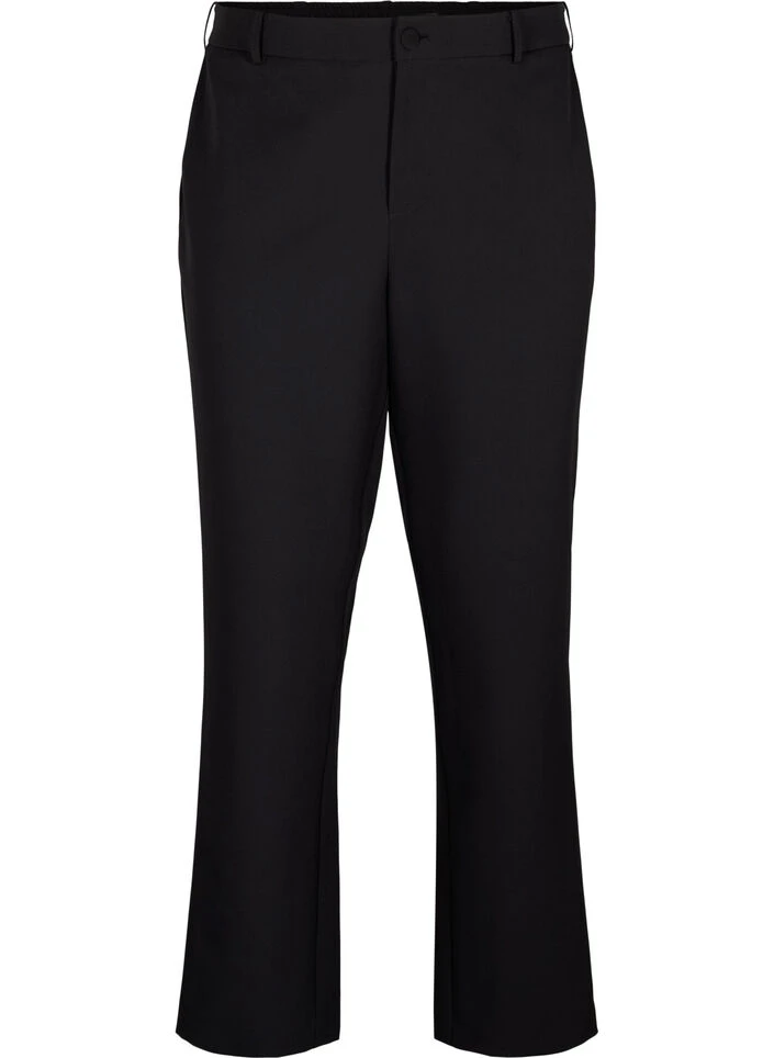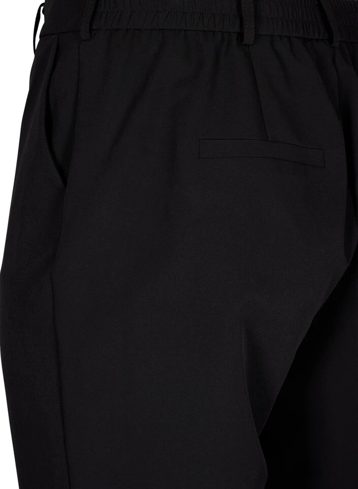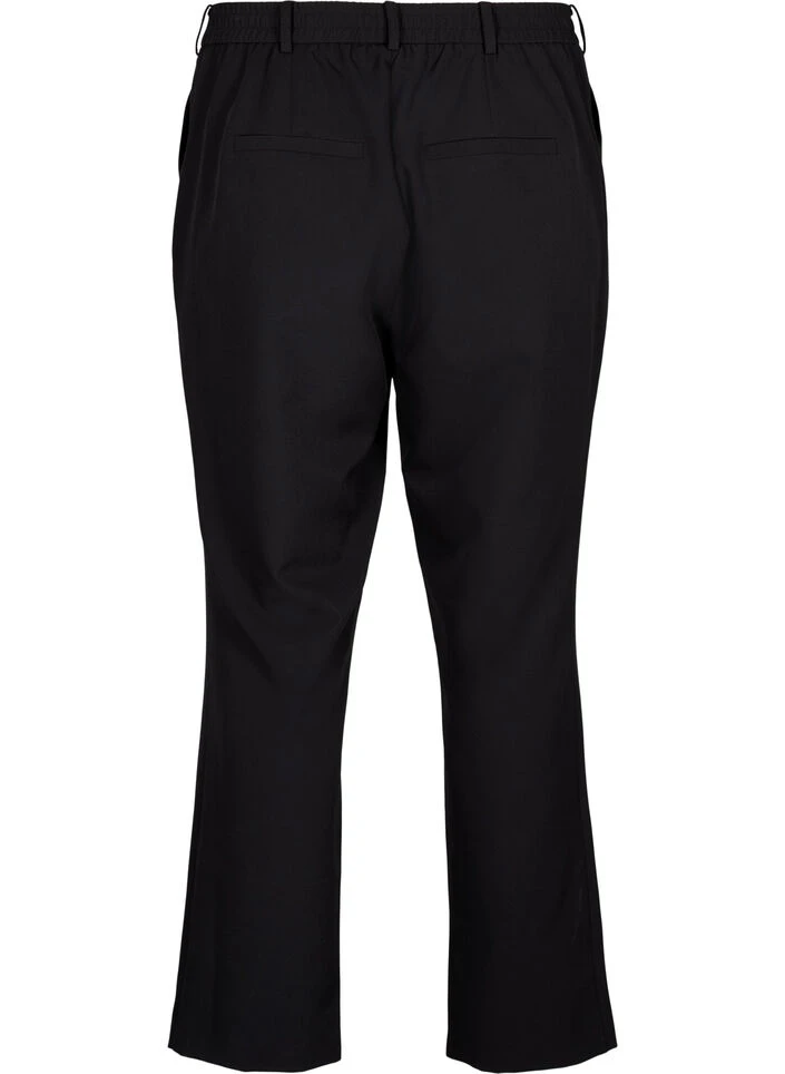 Straight leg trousers with side pockets and decorative back pockets without functional lining. The pants have belt loops, a zipper closure and an elastic waistband at the back.