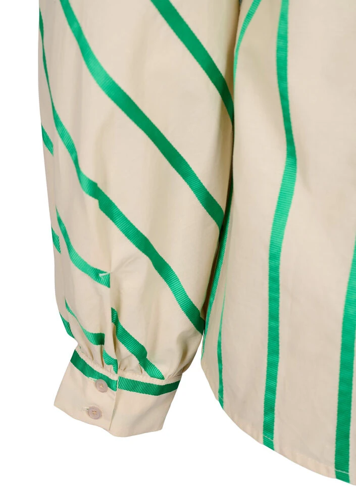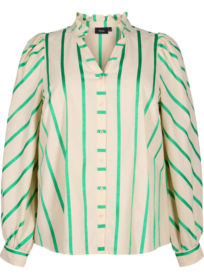 Cotton shirt blouse with a beautiful striped design. The shirt blouse has a v-neckline, ruffle collar and long sleeves with cuffs and small pleats on the shoulders for a slightly puffed effect.