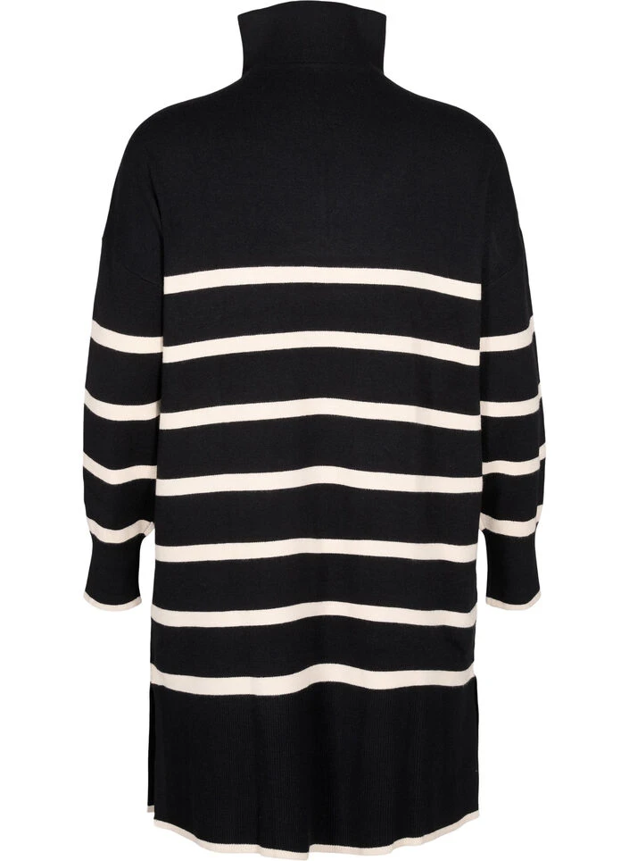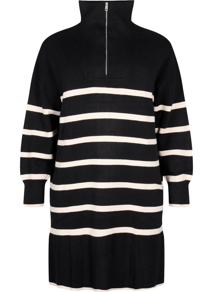 Striped knitted dress made from a soft and comfortable material mix with 50% LENZING™ ECOVERO™ Viscose. The dress is designed with a high zippered collar, wide ribbed cuffs and hem, and a comfortable fit with side slits.