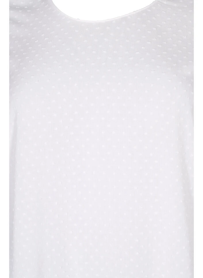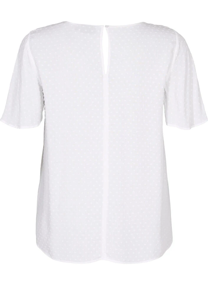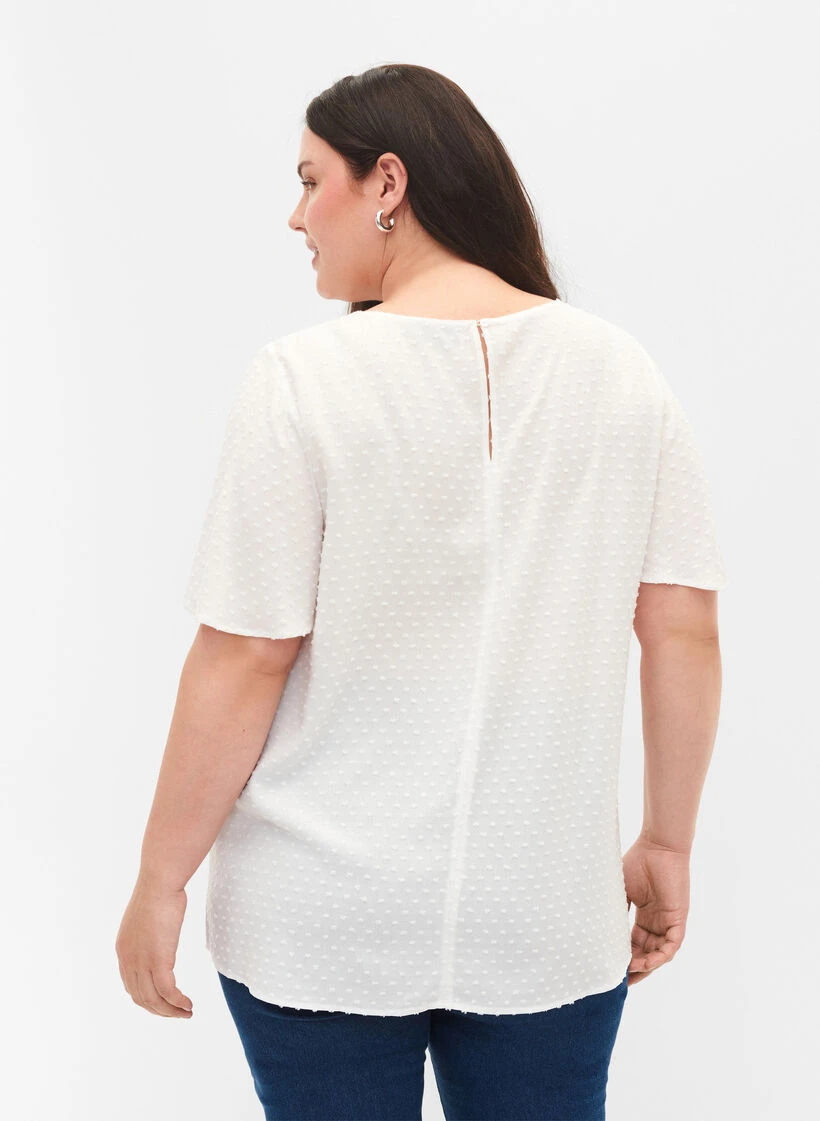 Nice blouse in 100% viscose with a textured pattern. It has a regular fit with short, loose bat sleeves and round neckline with button closure at the neck.