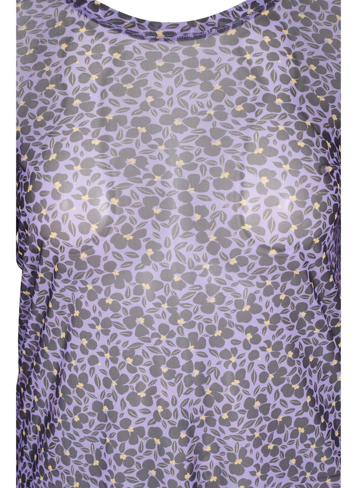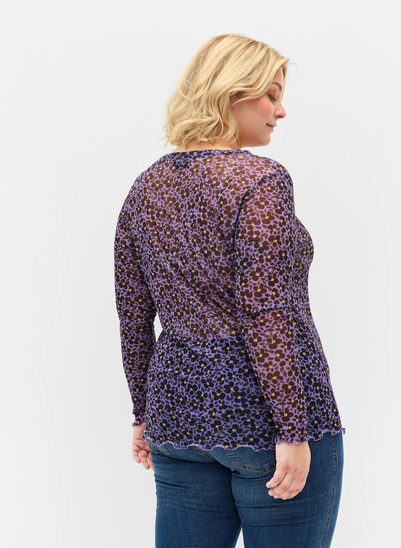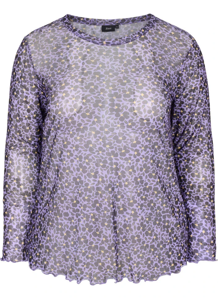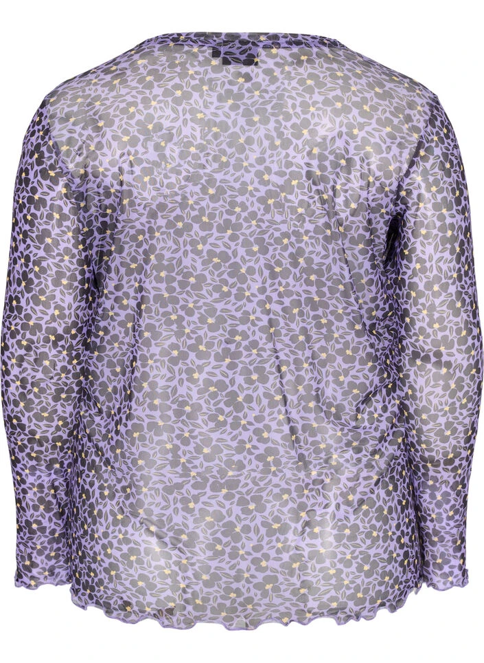 Tight mesh blouse with a nice all-over floral print. The blouse has a round neckline and long sleeves.