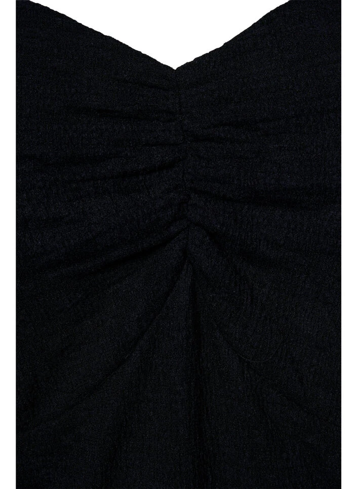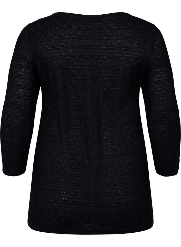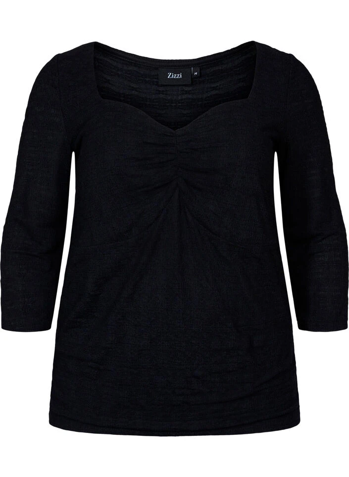 Fitted blouse made of a stretchy quality fabric with a beautiful texture. The blouse features 3/4 sleeves and a lovely neckline with vertical ruched detail on the chest.