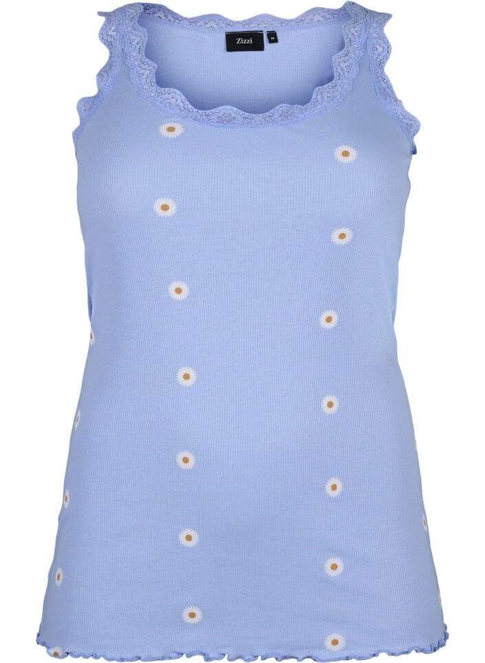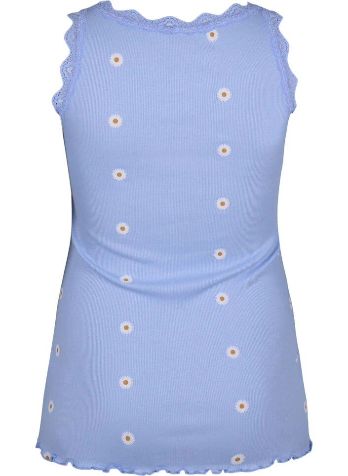This top is made from a soft and comfortable cotton, and modal blend with a nice print. The top is finished with an elegant lace trim at the neckline and along the straps.