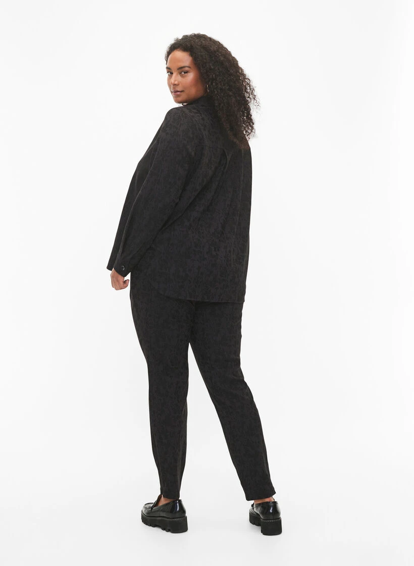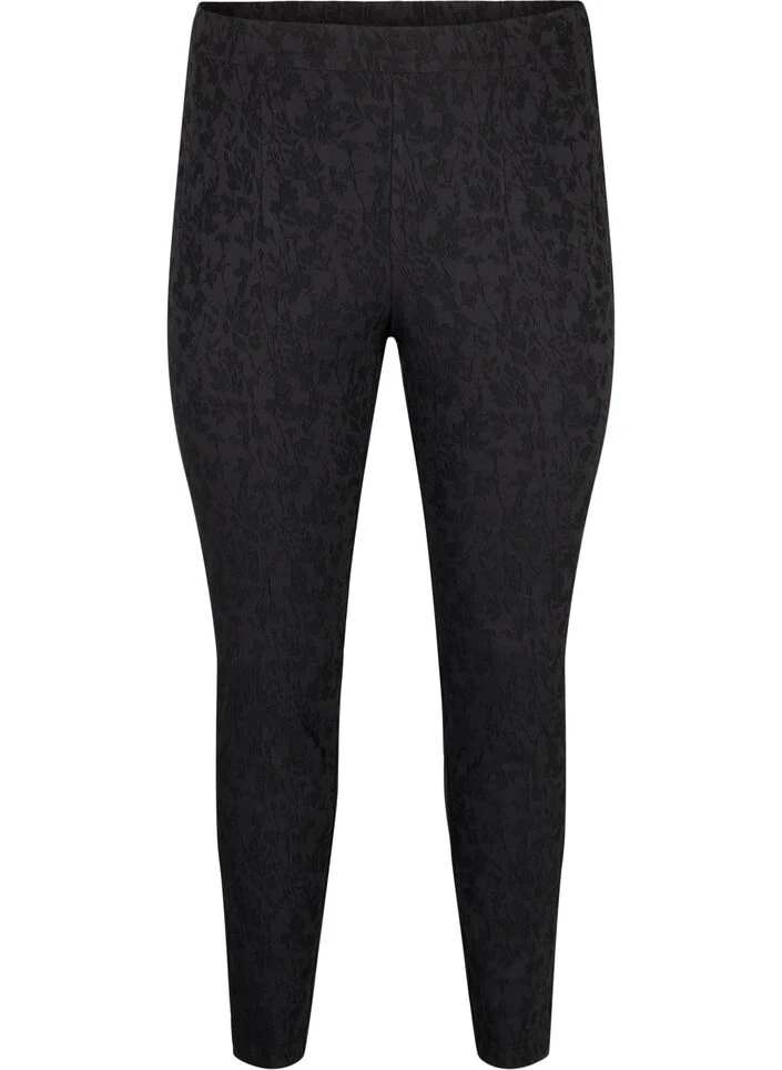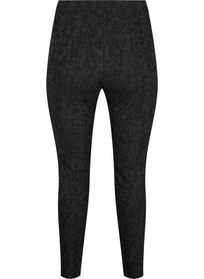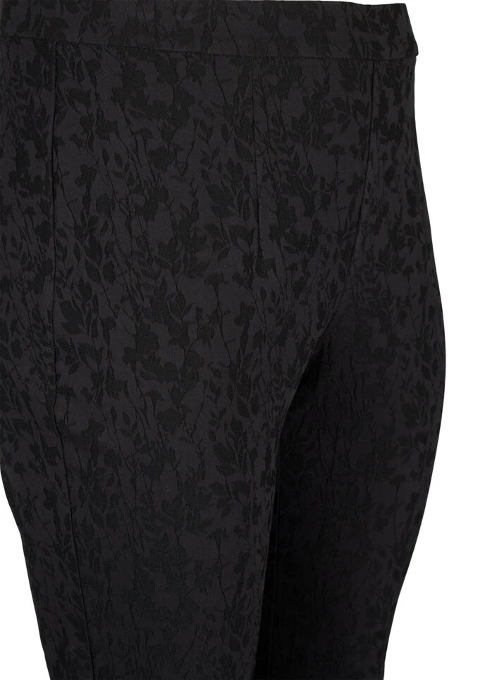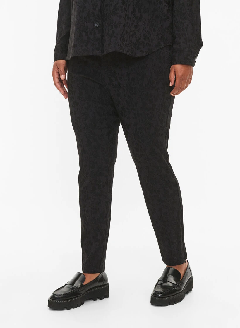 Tight-fitting trousers with a beautiful tone-on-tone pattern and zipper detail at the bottom of the leg. The trousers are made from a comfortable and stretchy viscose fabric with elastic waistband.