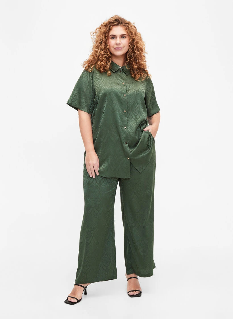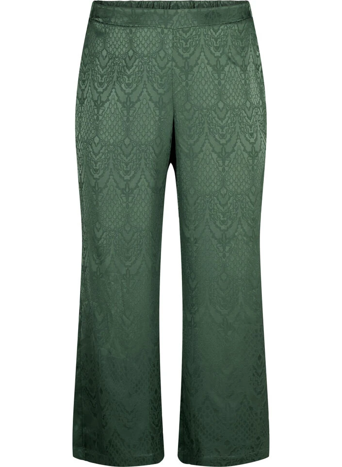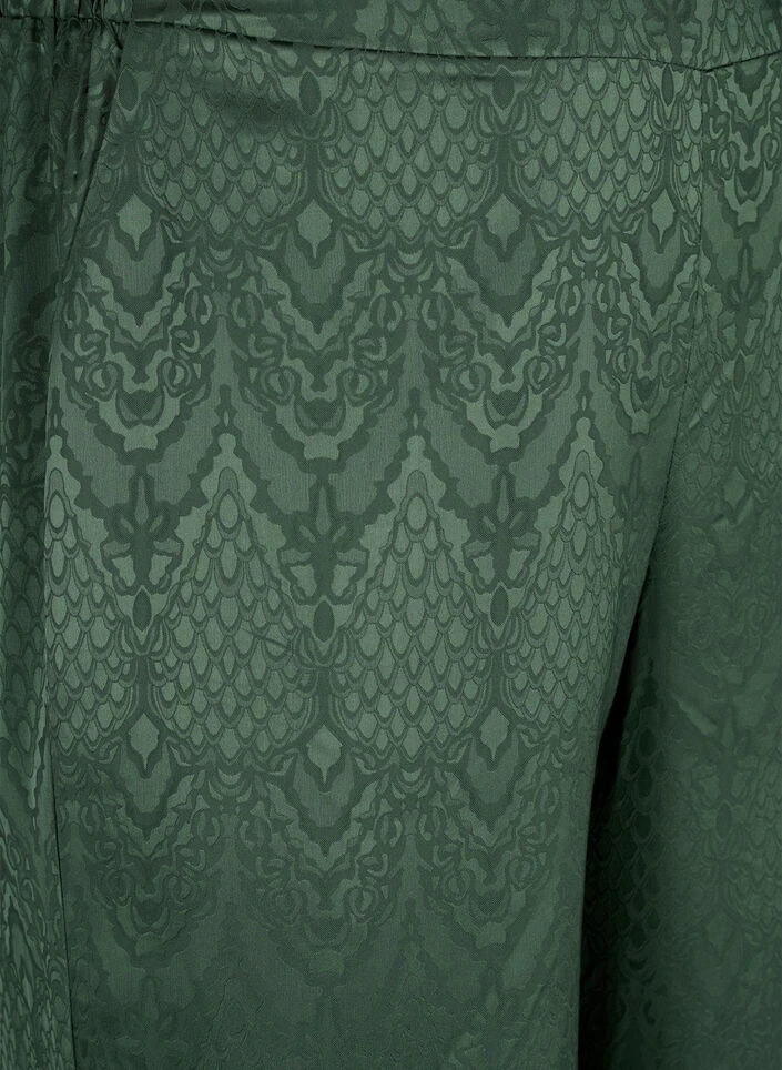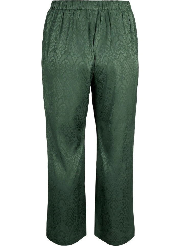 Trousers in a beautiful tone-on-tone satin jacquard made from 51% recycled polyester. The pants are designed with a straight fit, regular waist height with elastic at the back and side pockets.