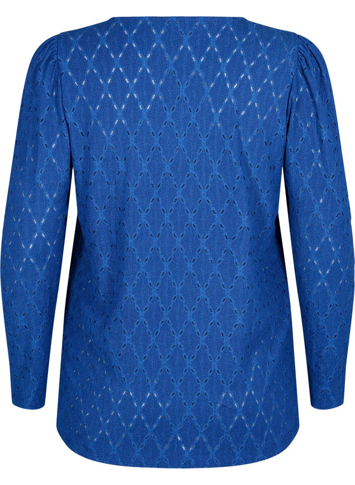 Long-sleeved blouse with a decorative lace pattern. The blouse is designed with a V-neck and a regular fit.