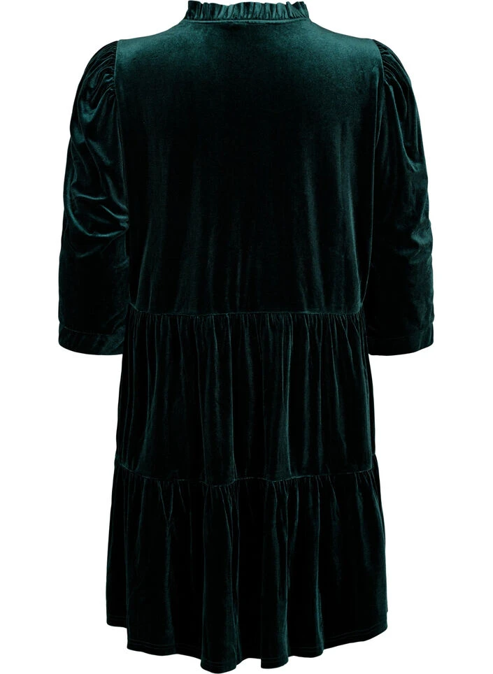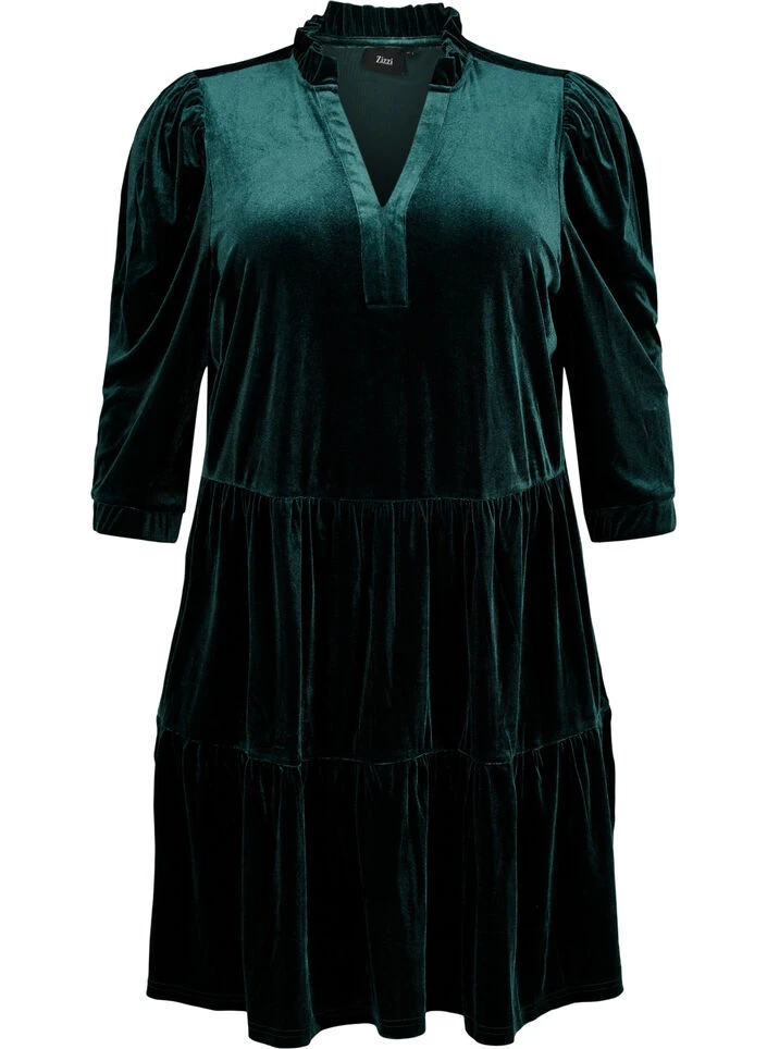 Feminine velour dress with cutlines that make the dress drape beautifully on the body. The dress features a V-neckline, ruffle collar, 3/4 sleeves, and small pleats on the shoulders, creating an elegant puff effect.