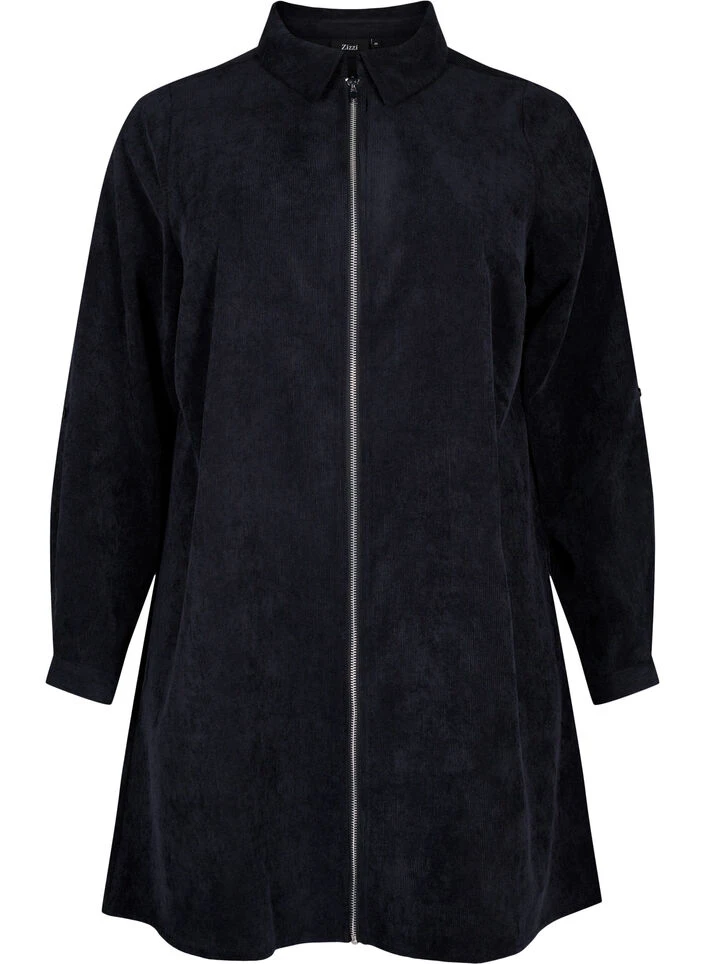 Short shirt dress in soft and stretchy velvet quality with 51% recycled polyester. The dress is designed with 3/4 sleeves with turn-ups, a zipper closure and a loose-fitting A-line shape.