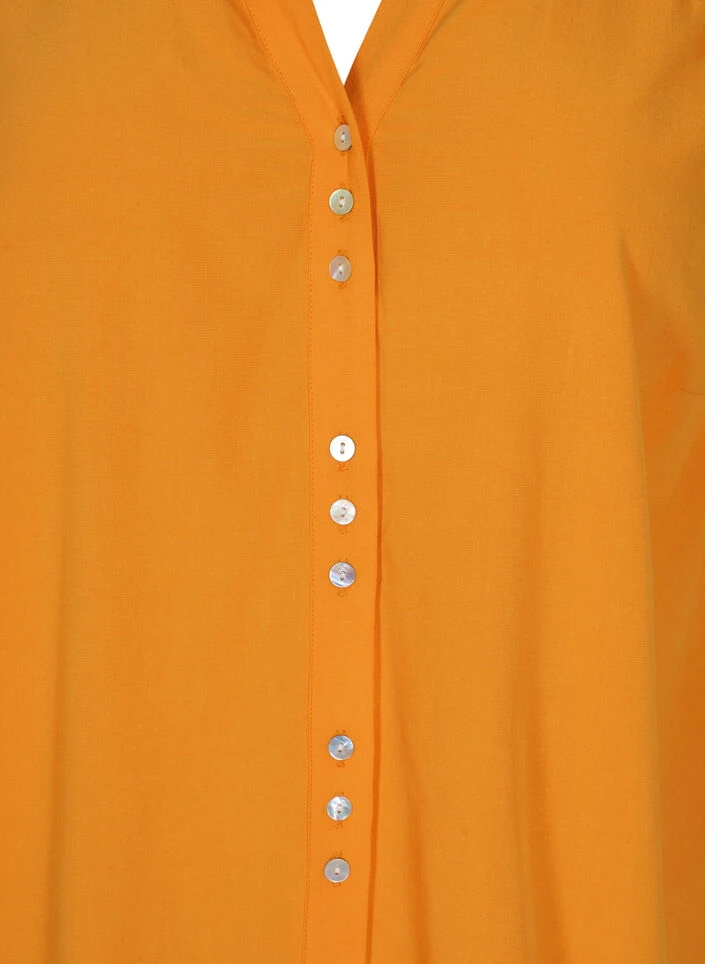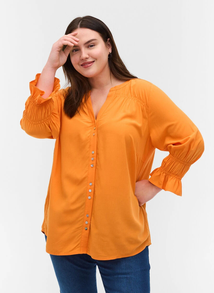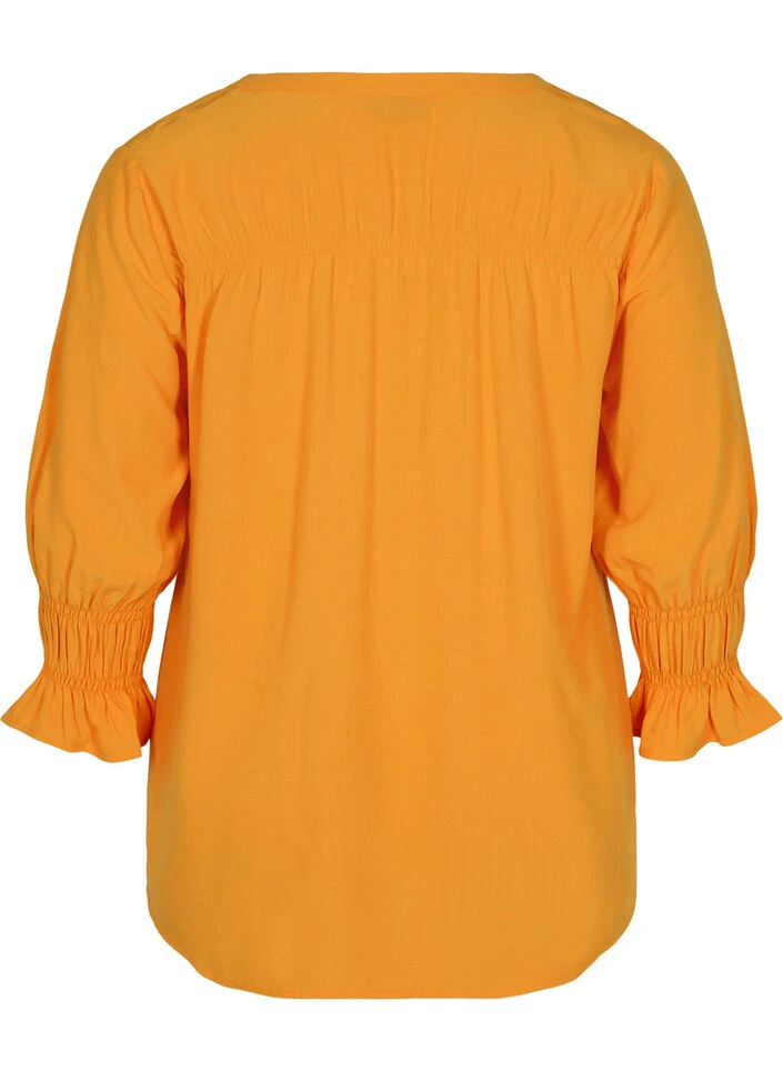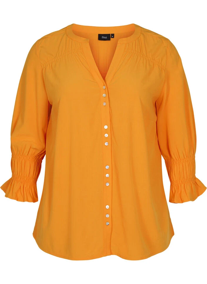 Classic blouse in 100% viscose, which has a button-through fastening on the front. The blouse has a v-neck and 3/4-length sleeves with smocking that creates a feminine ruffle.