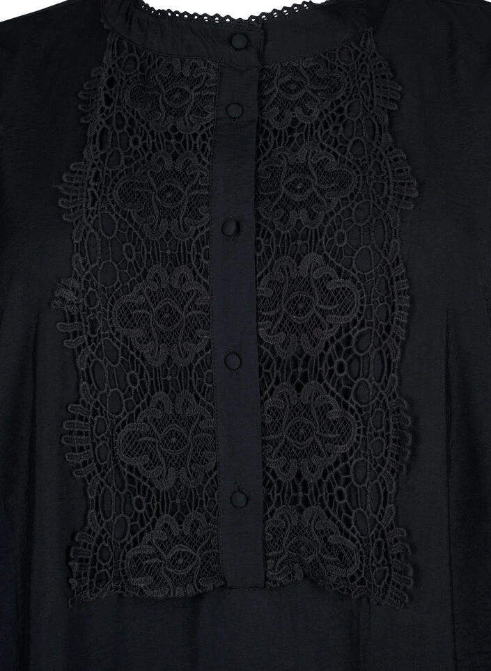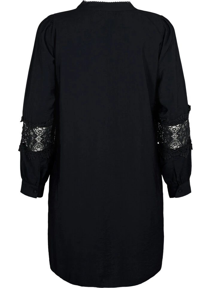 Beautiful dress in a lovely viscose quality with a loose fit. The dress is designed with exquisite crochet details, a round neck, a short button closure, and long sleeves with cuffs.