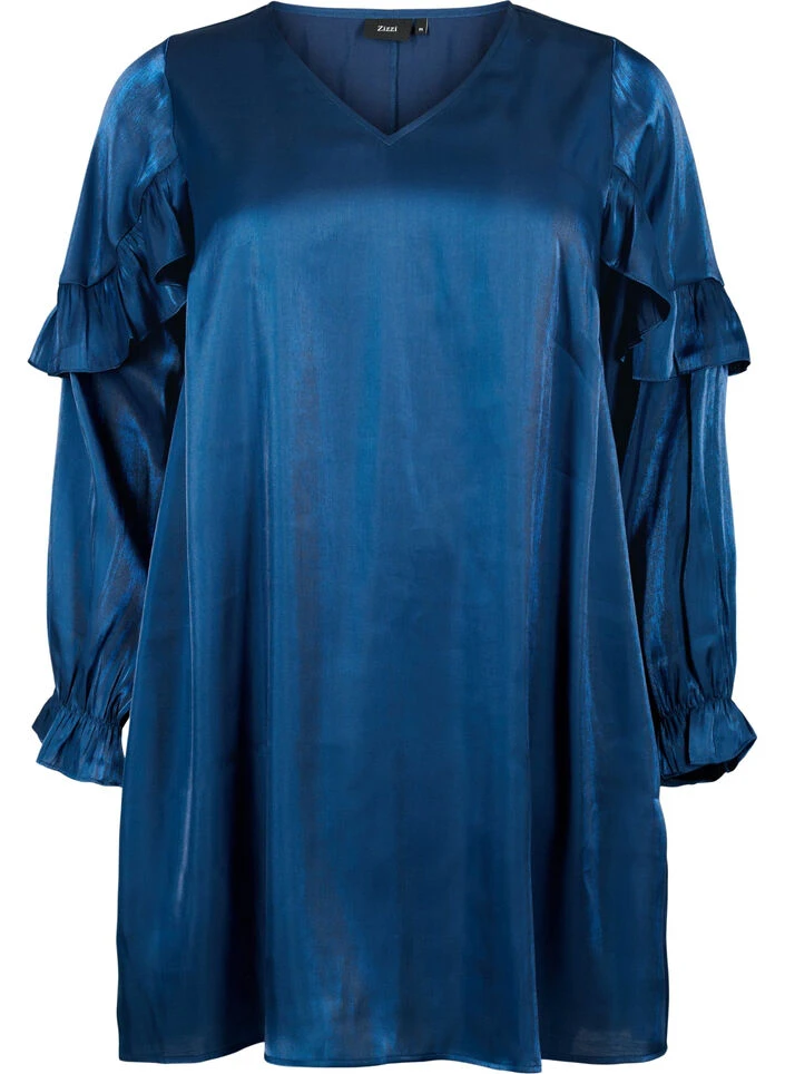 V-neck dress with long sleeves and feminine ruffle details. The dress is made of a shiny viscose fabric with 85% LENZING™ ECOVERO™ Viscose and is a regular fit.