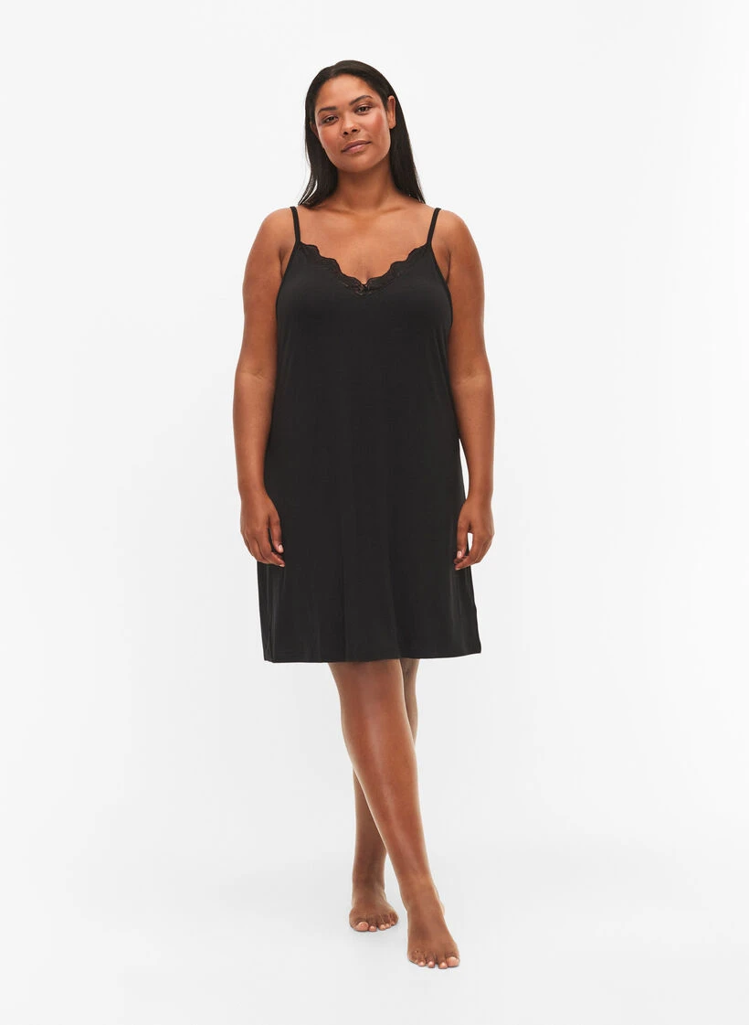 This feminine nightgown is made from a comfortable viscose fabric with stretch. It has a simple design with thin, adjustable straps as well as a V-neck with lace trim. The dress has an A-line shape that makes it sit nicely on body.