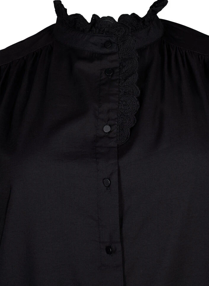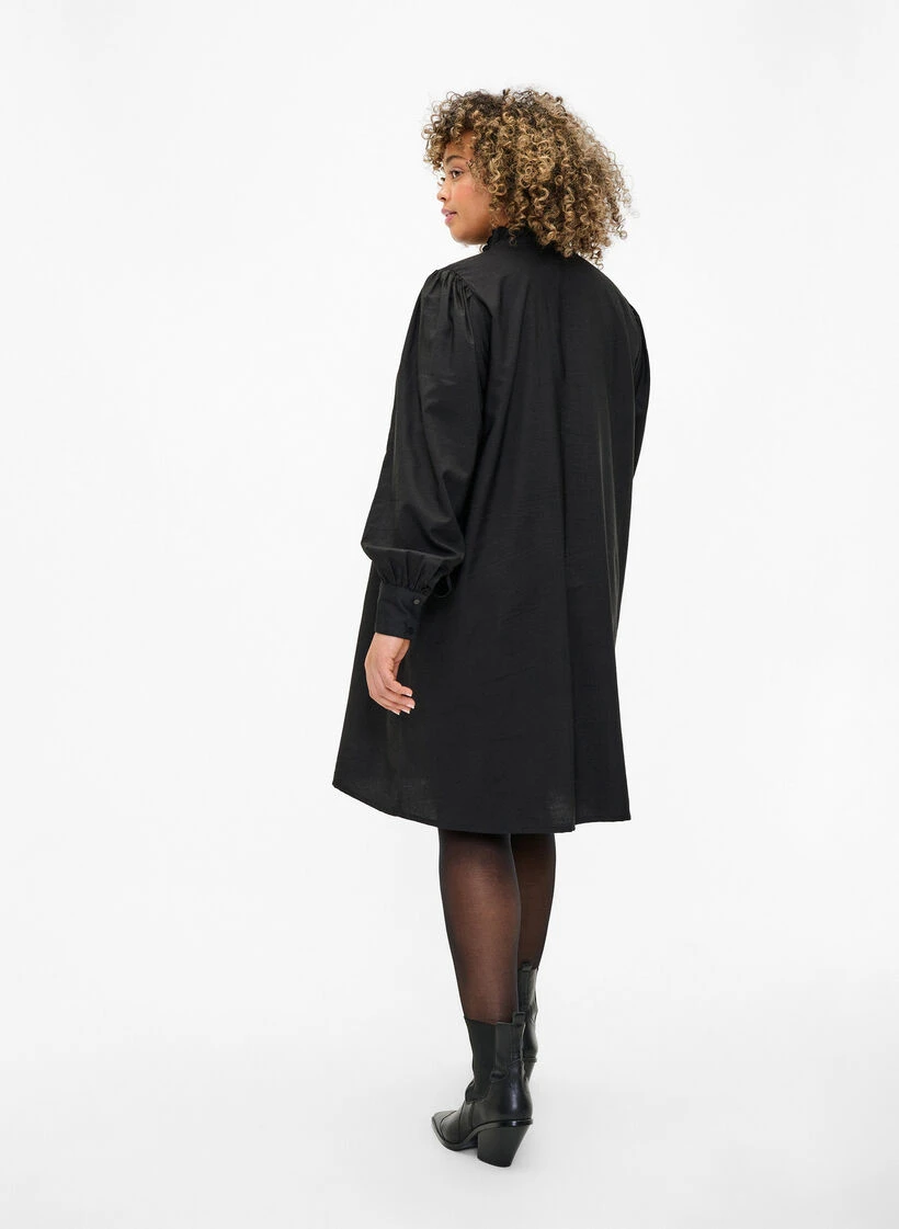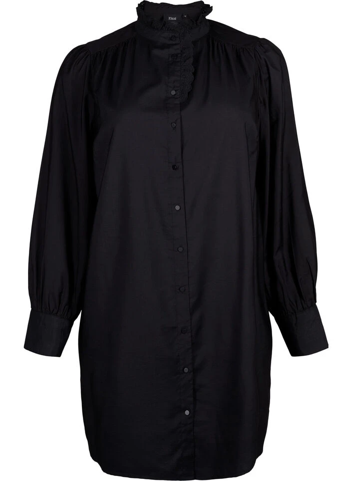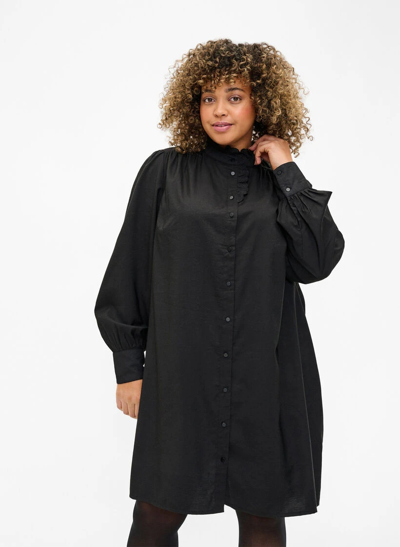 Feminine shirt dress with a decorative frill detail on the placket and collar. The dress has long sleeves with wide cuffs and small pleats on the shoulders that create light puff sleeves, and is made from a lovely viscose quality.