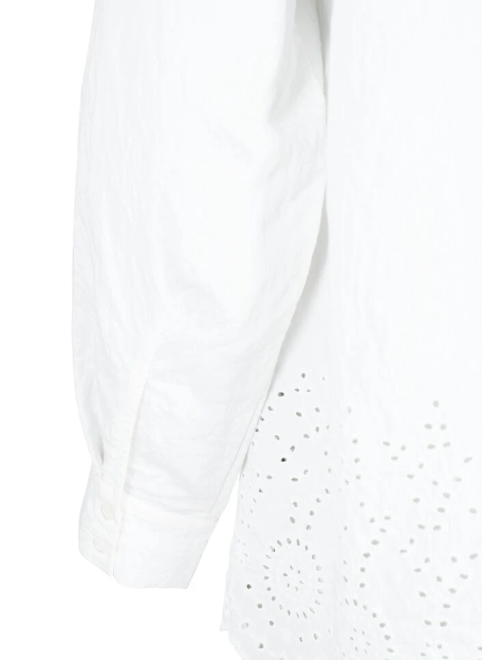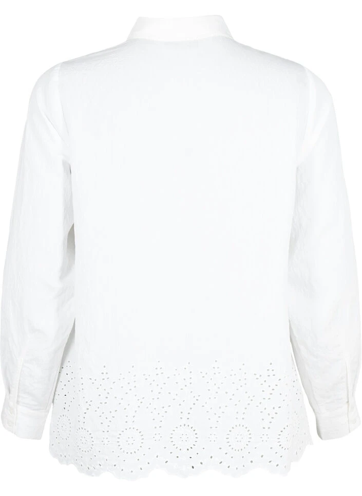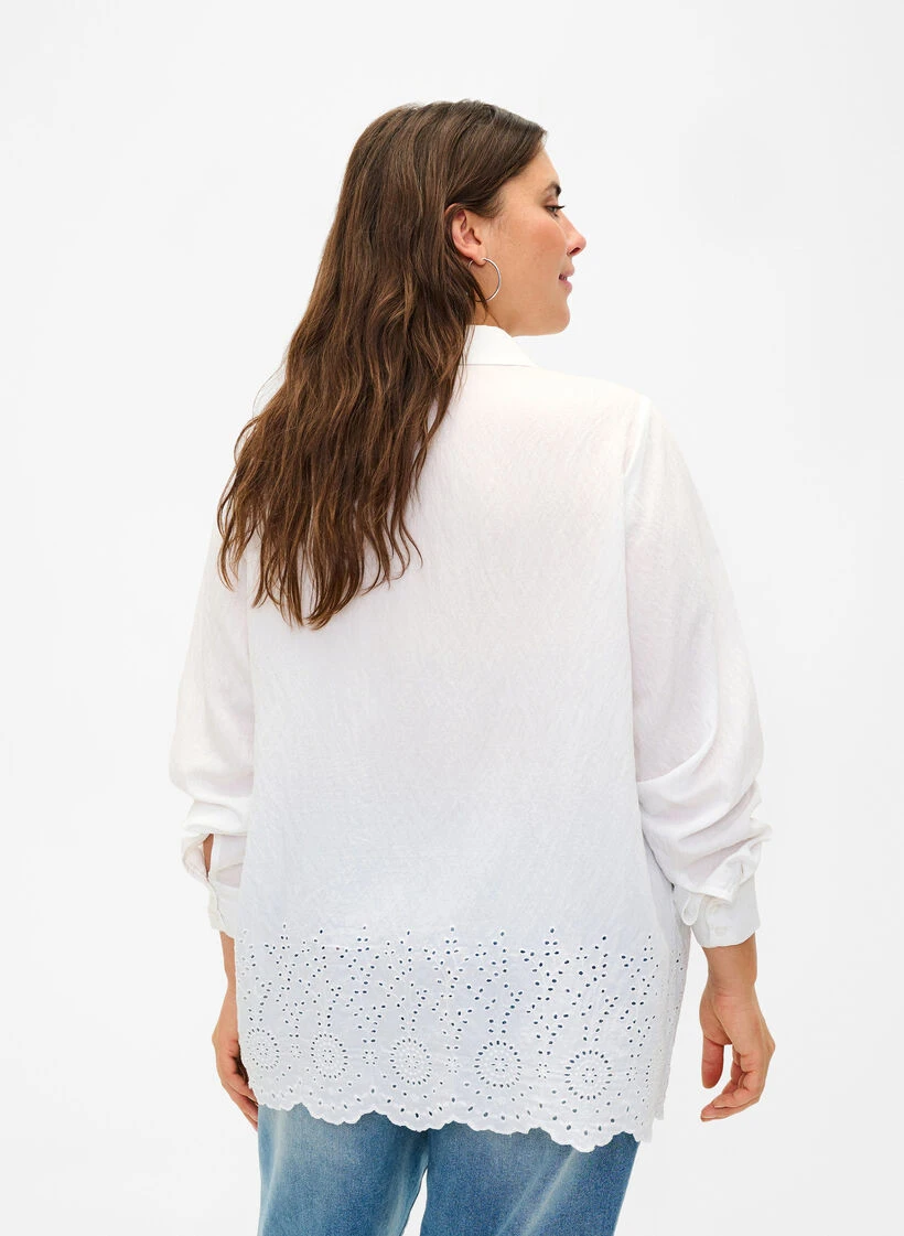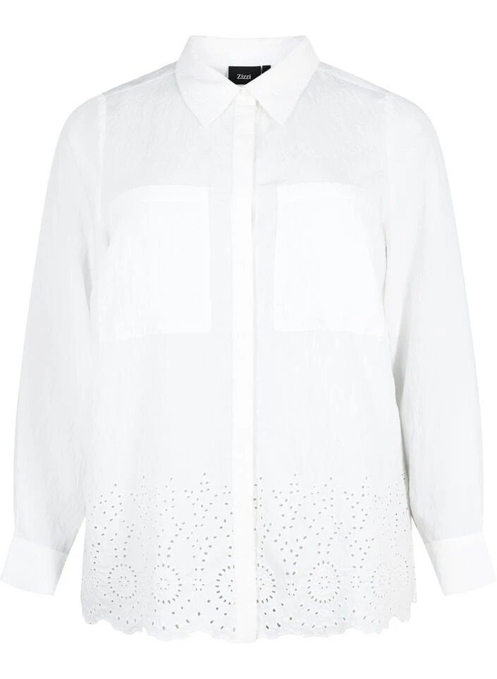 Solid-colored shirt with chest pockets and hidden button closure. The shirt is made of a lovely viscose quality with beautiful broderie anglaise detail at the bottom.
