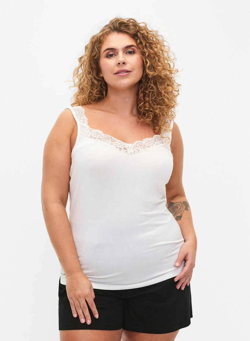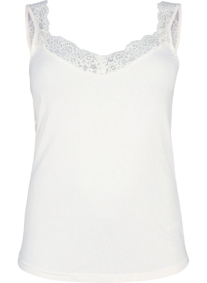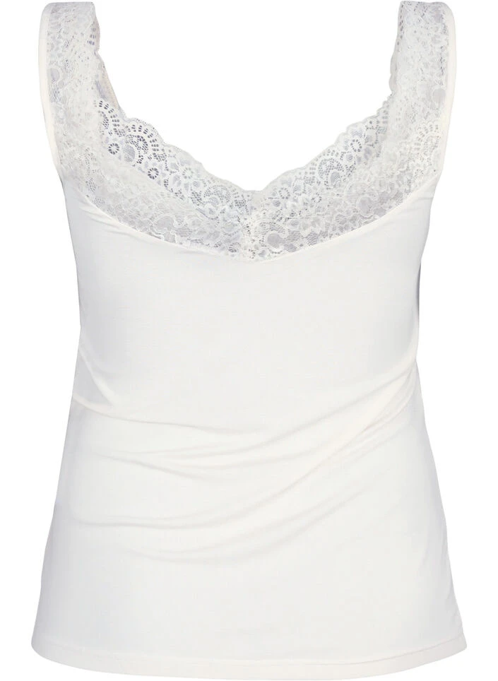 Feminine top in a nice and stretchy viscose fabric. It has cute lace trim on both the straps and the neckline.