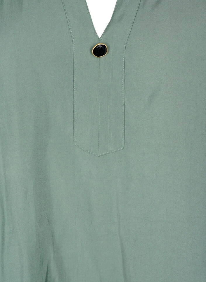 Tunic in soft viscose with a V-neck with button fastening and 3/4 sleeves. The tunic has a loose A-shape with small pleats at the back for a fine draped look.