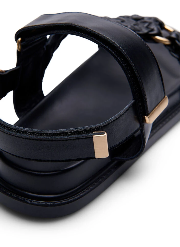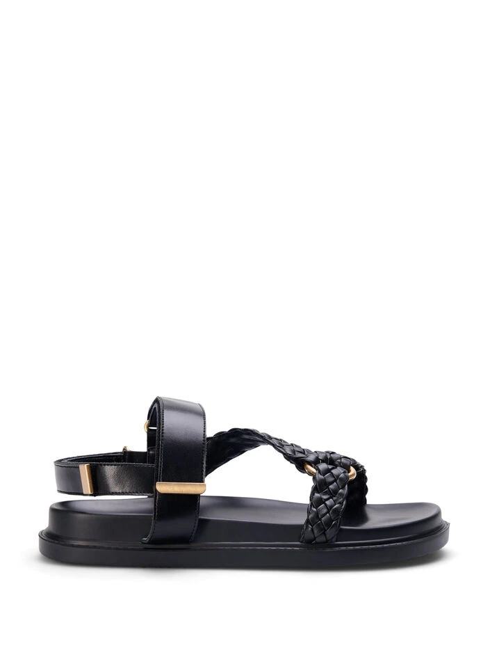 Leather sandal with braided straps and a wide fit. The heel strap and top strap are adjustable with Velcro for optimal fit.