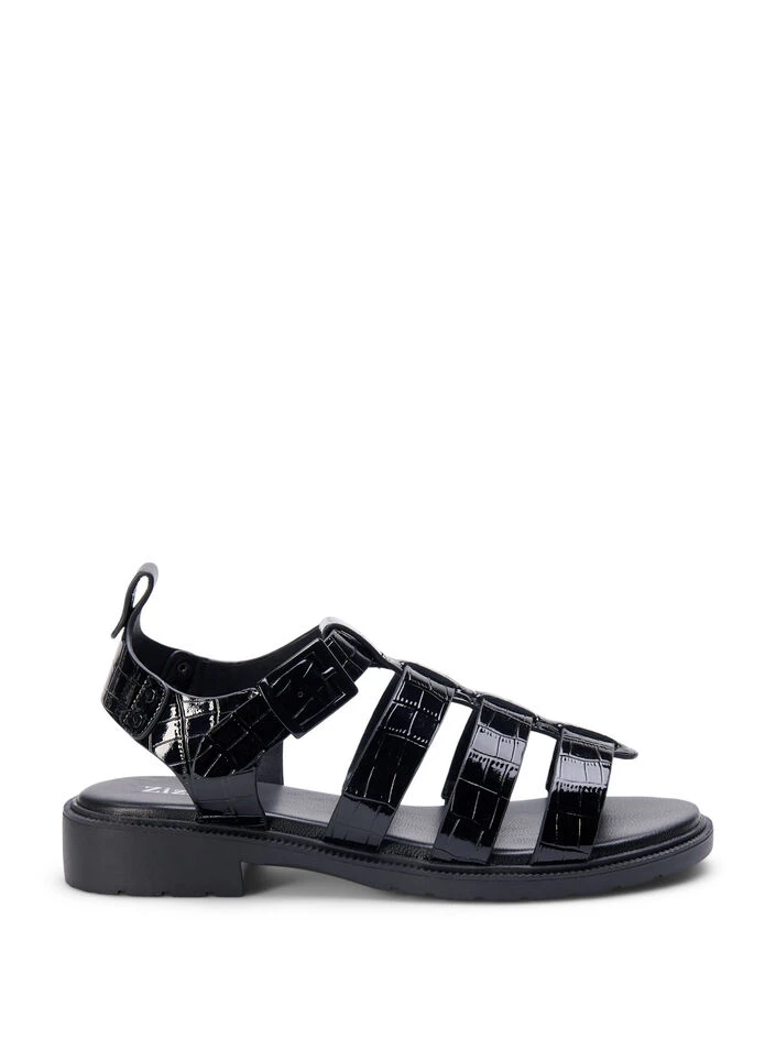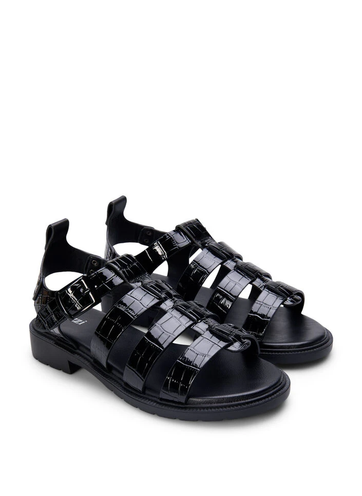 Sandal in shiny leather with crocodile pattern and a wide fit. The sandal is designed with a small discreet heel for a more elegant look