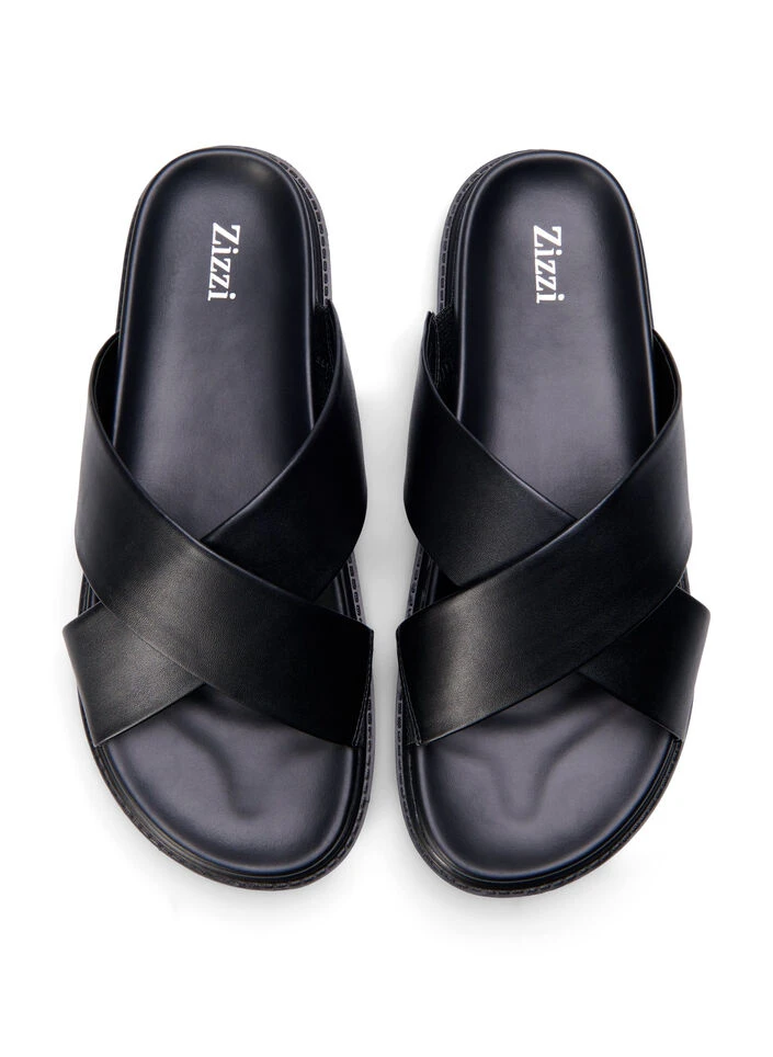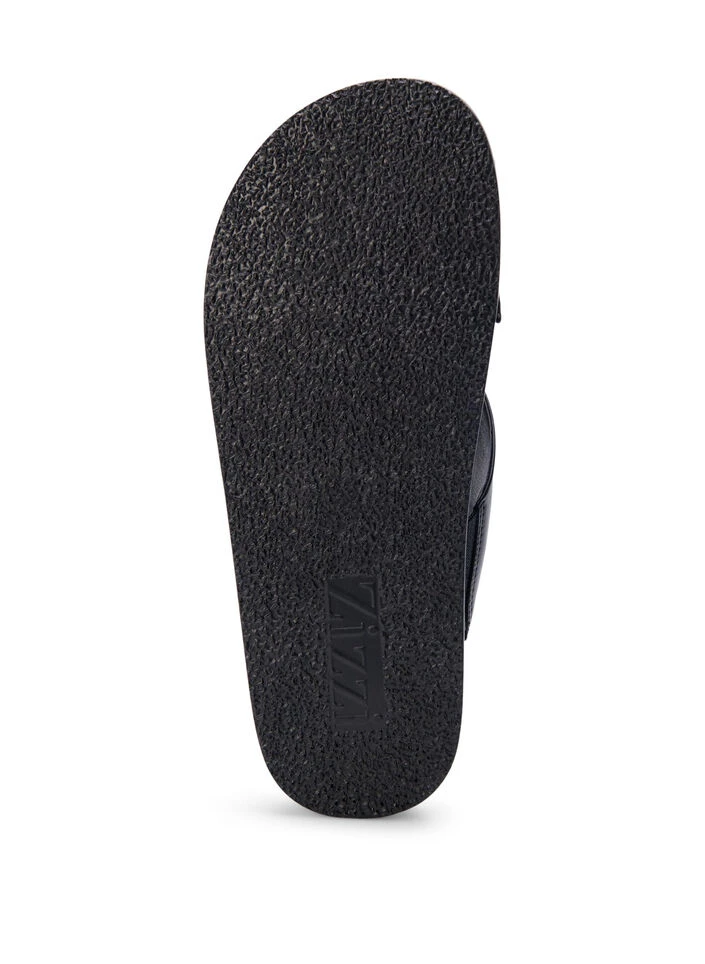 Faux leather sandal with a wide fit. The sandal is designed with wide crossed straps and elastic panels on the inside, ensuring a flexible fit that adapts to your foot for optimal comfort and support.
